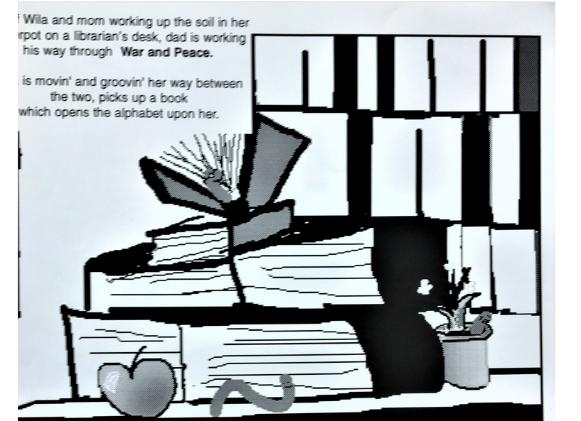 (she reaches for a book and letters of the alphabet fall out on the desk, each one a book in itself)