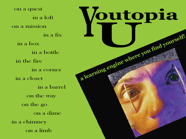 When students integrate data through participation in this project based collective process, they re-experience the cause and effect of their real world actions, behaviors and decisions. Youtopia was listed in NASA's 1999 Learning Technology's Project Index as a cutting edge tool for promoting both personal and social missions while fostering an inner dialogue examining social principles and practices. |